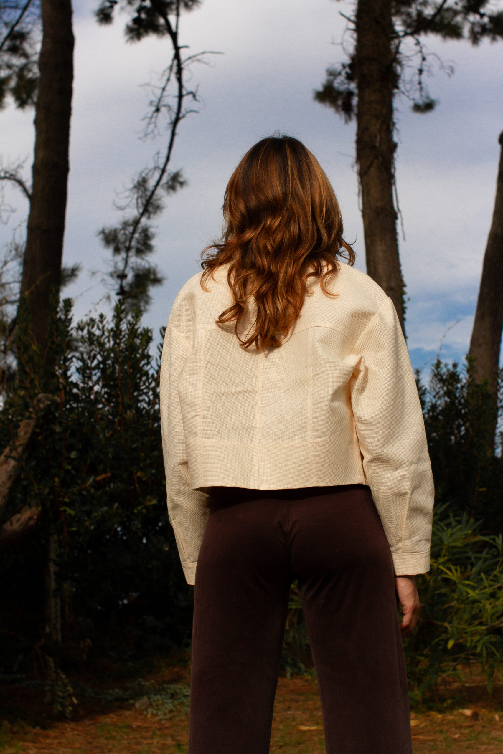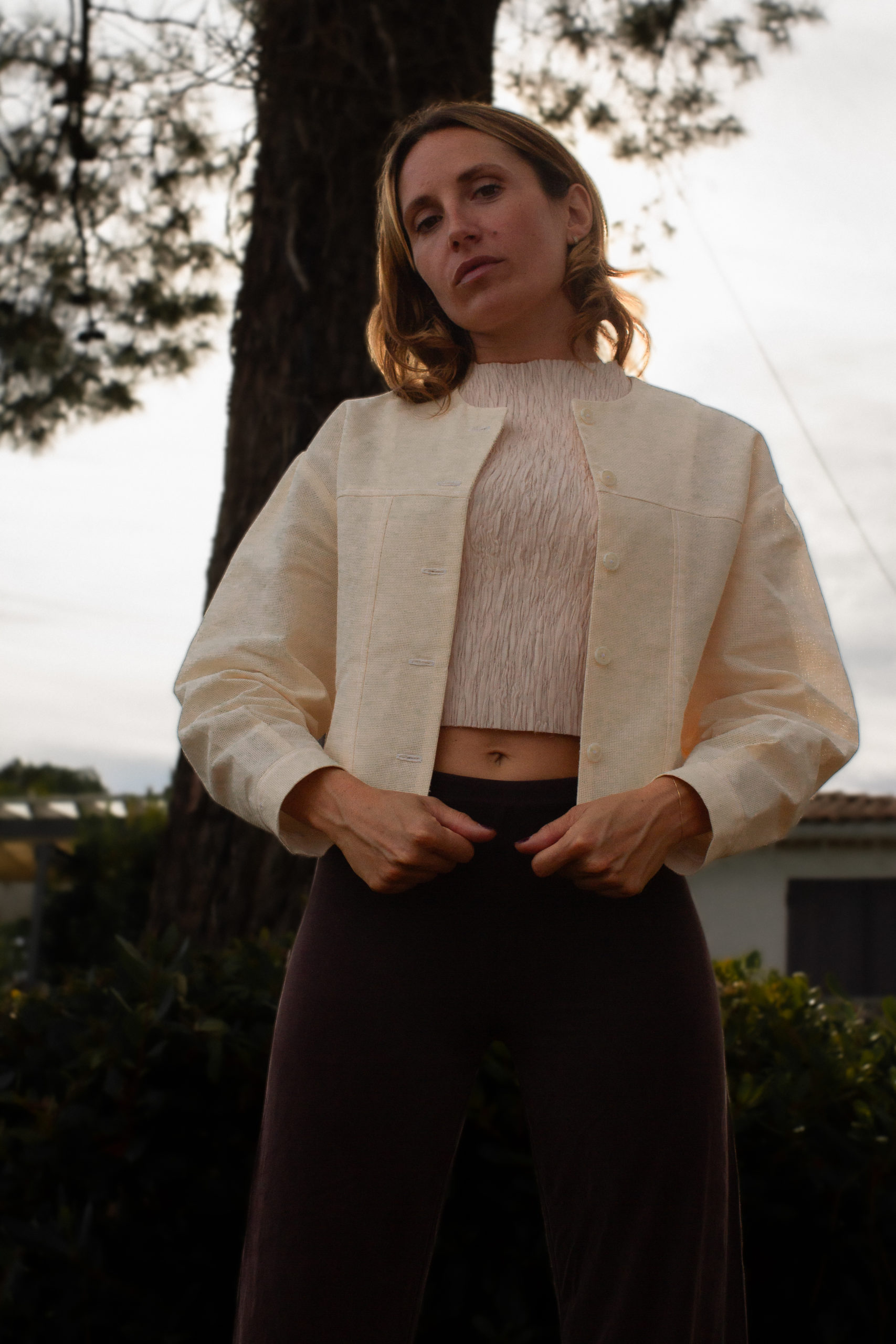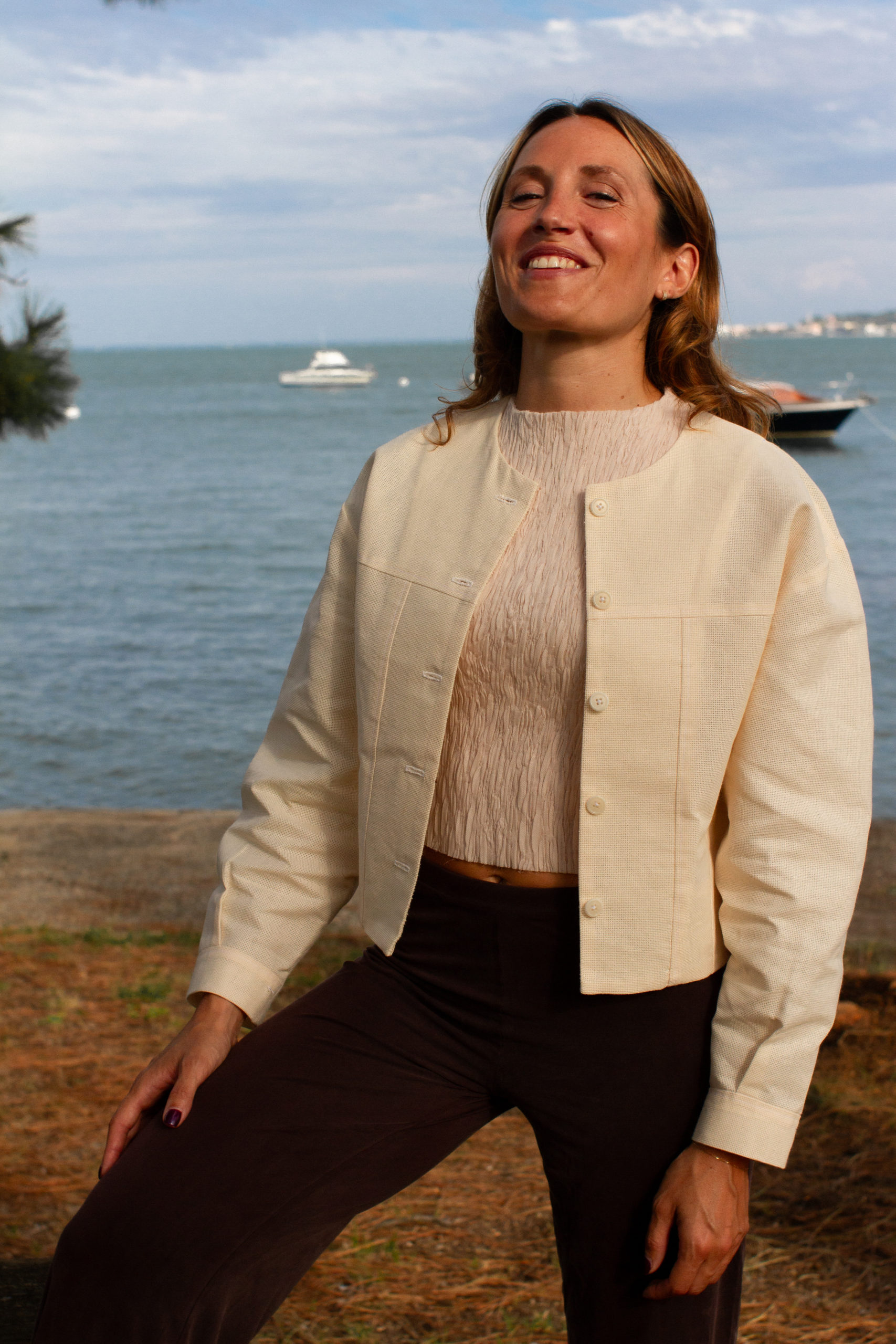 - Vêtement non doublé, finitions en biais, coutures rabattues ou couchées et surpiquées.
